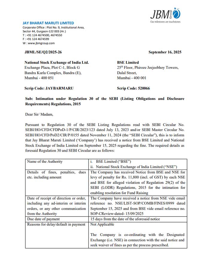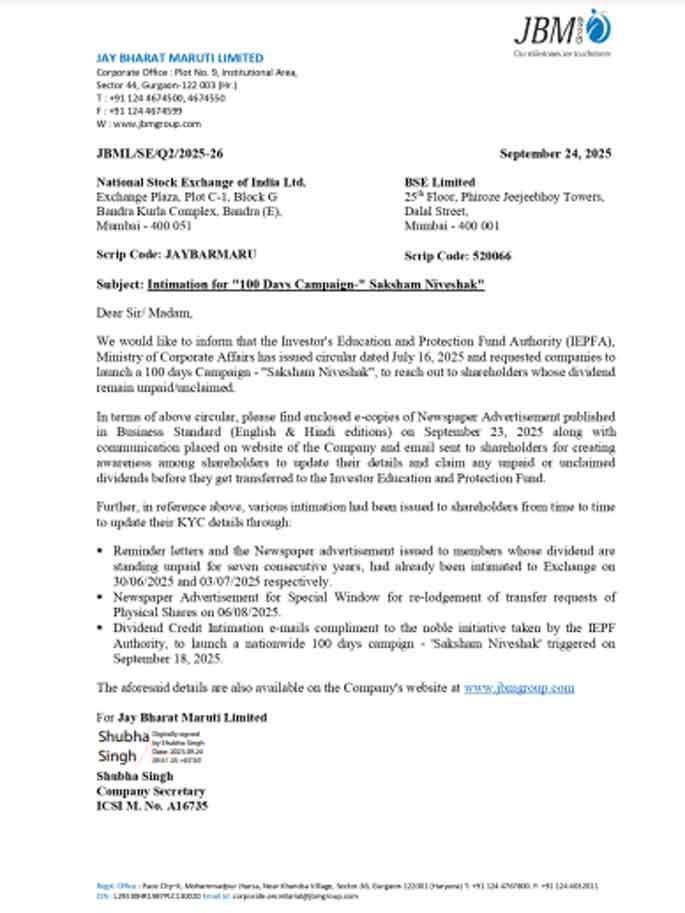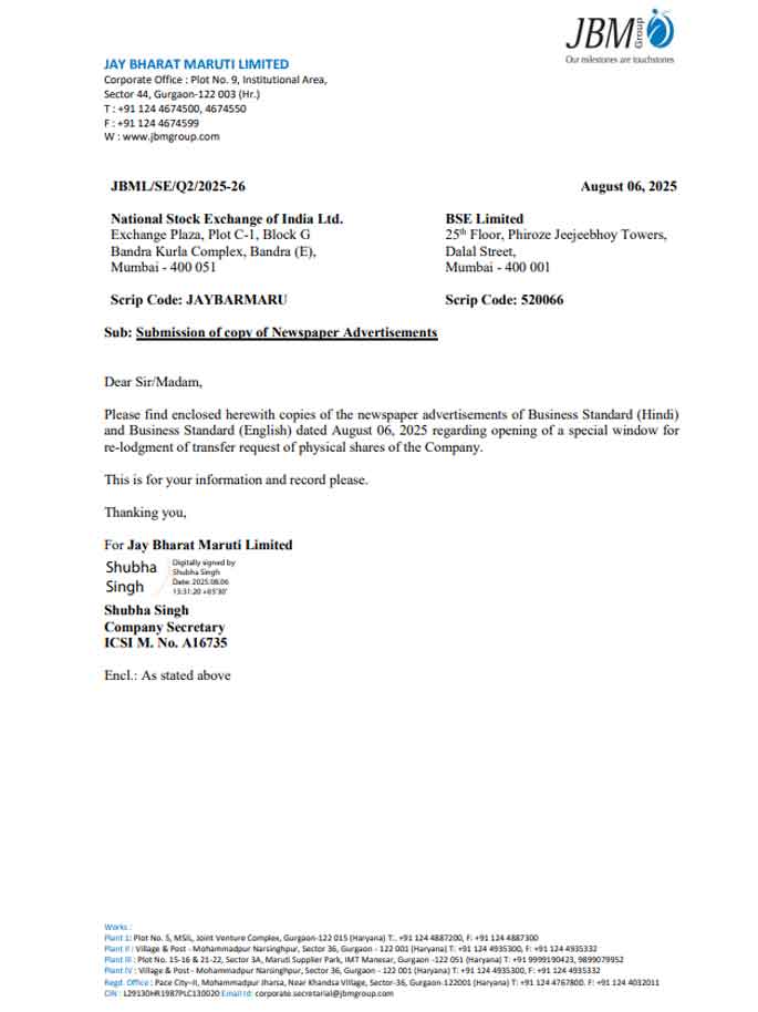 JBML Appointment of Secretarial Auditor F.Y.2025-2030